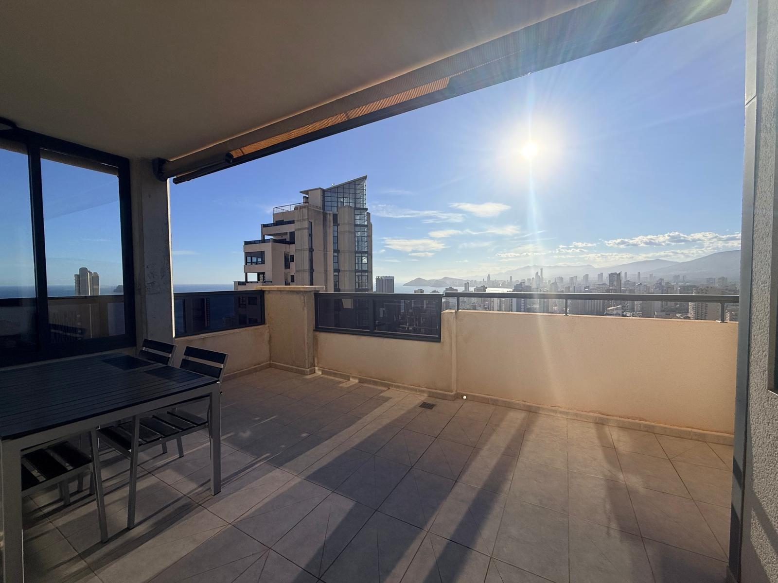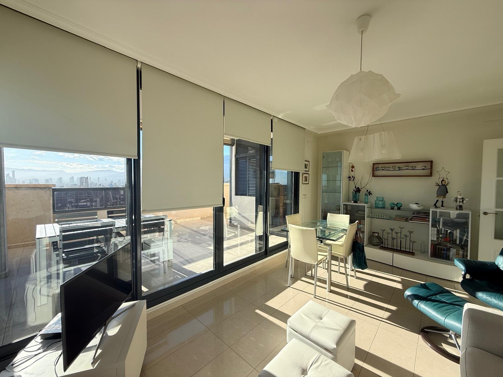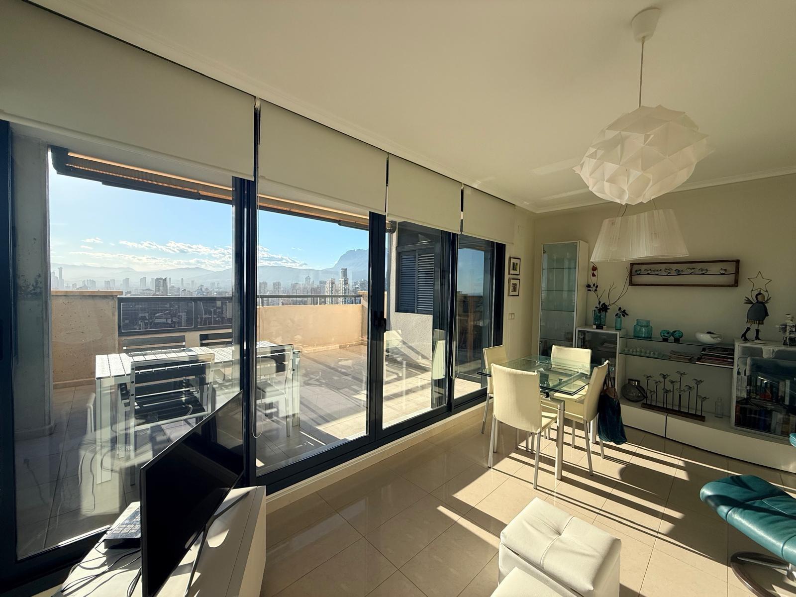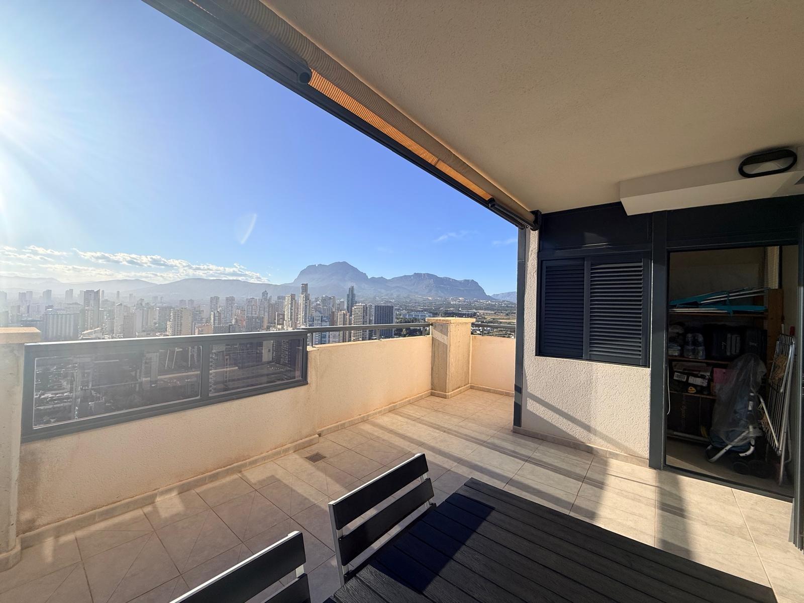 Inmobiliaria LES DUNES ofrece en exclusiva este maravilloso ático en la moderna urbanización Gemelos 26, en el Rincón LLano a unos 400 metros de la Playa de Levante.~El piso ofrece unas dimensiones superiores a las de el resto de las~viviendas. Tiene 2 dormitorios, uno de ellos con una terraza con vistas al mar y baño en suite, otro cuarto de baño adicional, amplio salón-comedor con acceso a una terraza de unos 30m2 que ofrece unas vistas espectaculares y panorámicas al mar, montaña y a la ciudad de Benidorm. En la terraza hay un pequeños trastero/despensa.~~La cocina es independiente y ofrece vistas panorámicas igualmente. ~~Además, incluida en el precio viene una plaza de garaje subterránea privada y cabinada, una característica muy~importante en una zona donde el aparcamiento es muy deseado.~La urbanización ultra moderna y completa cuenta con una piscina comunitaria en una zona ajardinada muy bien cuidada, una piscina climatizada interior para poder disfrutar todo el año, zonas de tenis, paddle e~infantiles.~Aproveche esta magnífica ocasión de ser propietario de este fantástico ático.~Venta 550,000.- €~