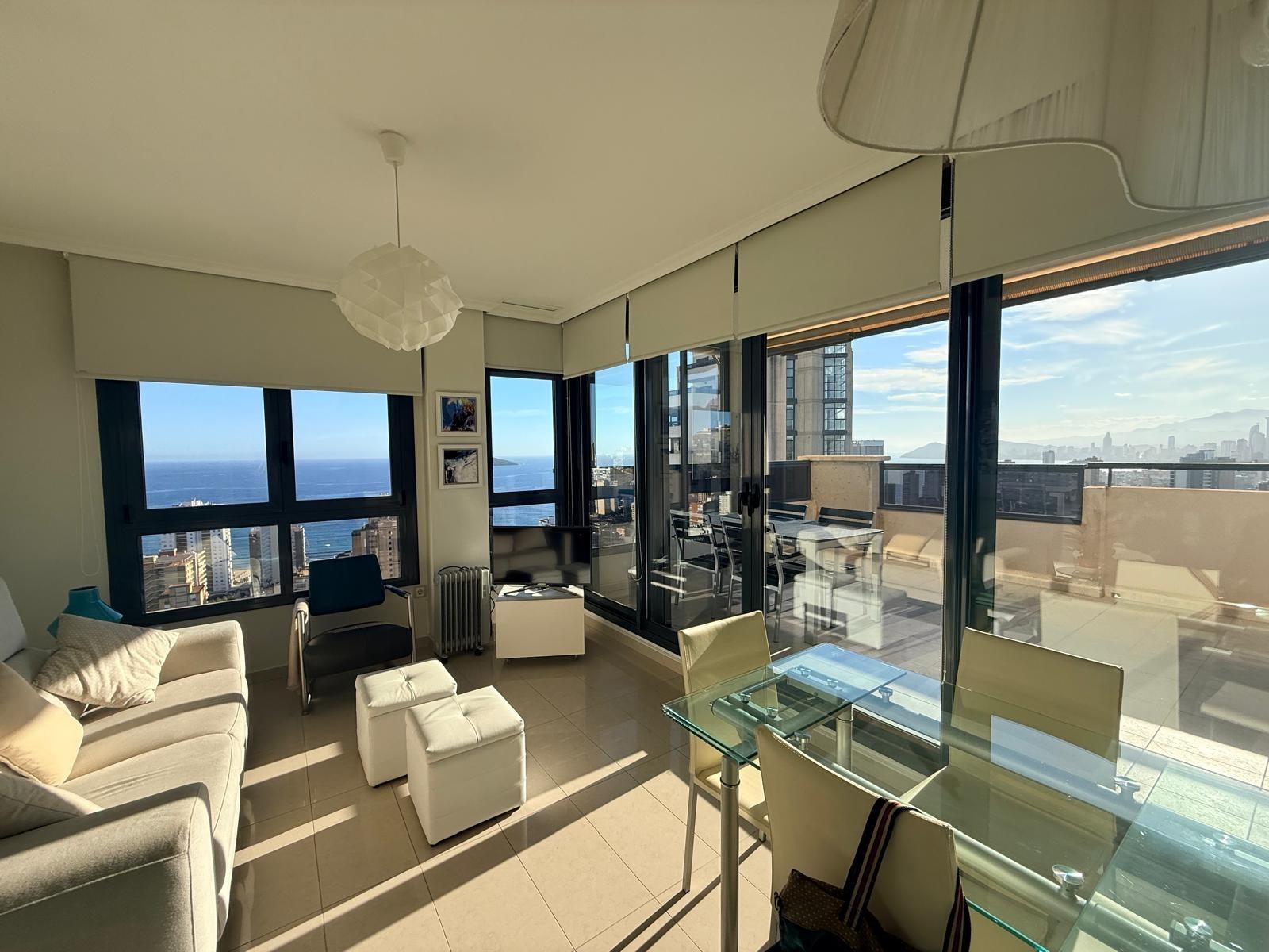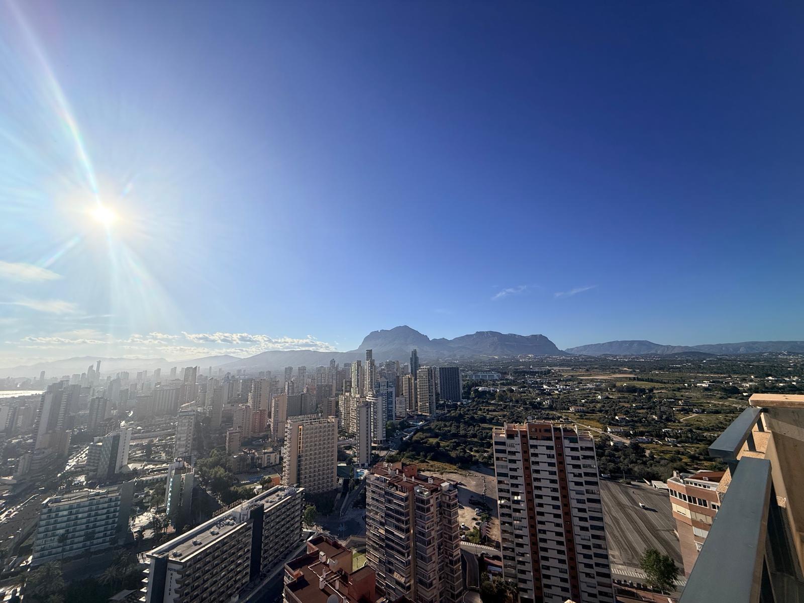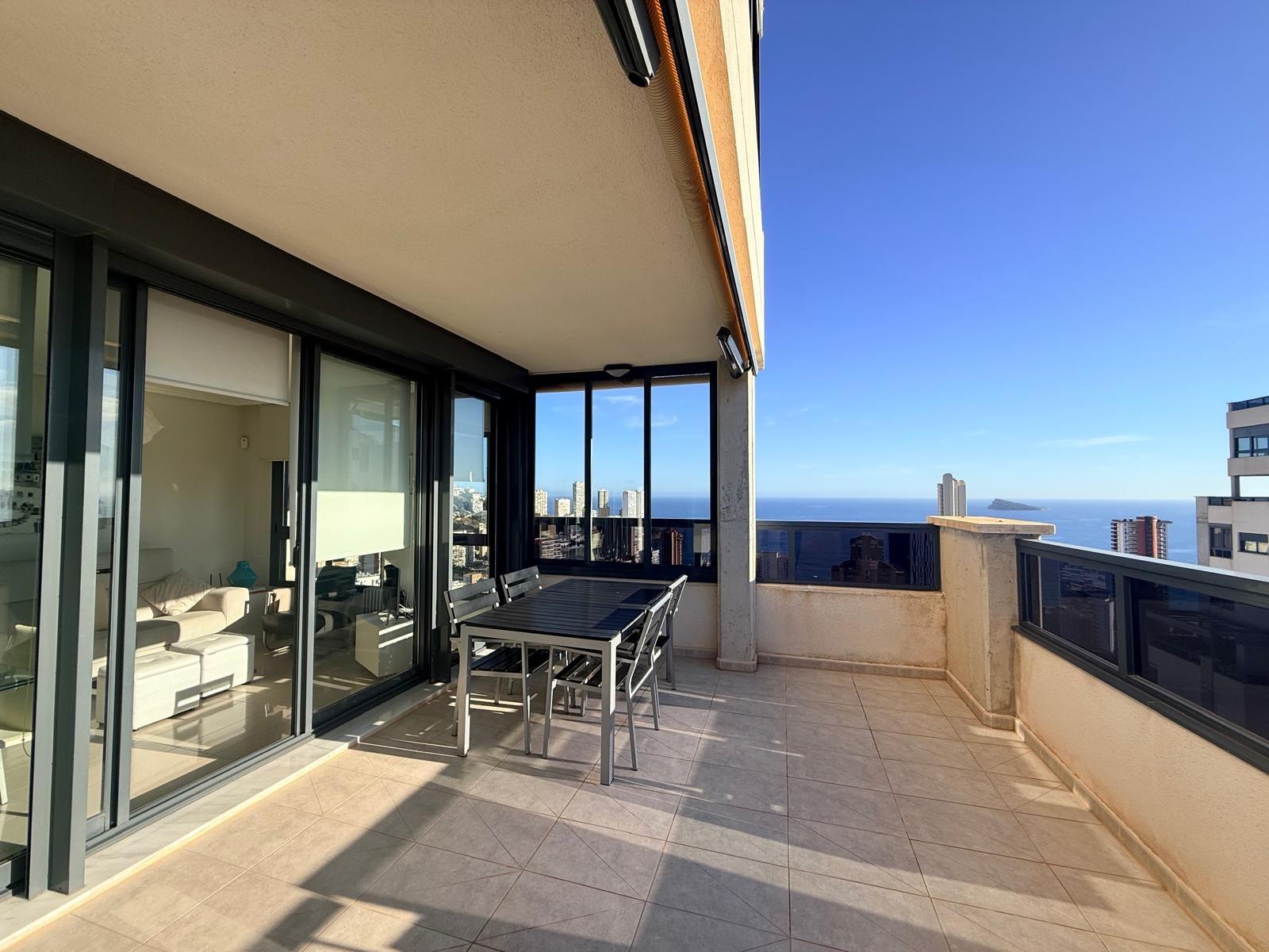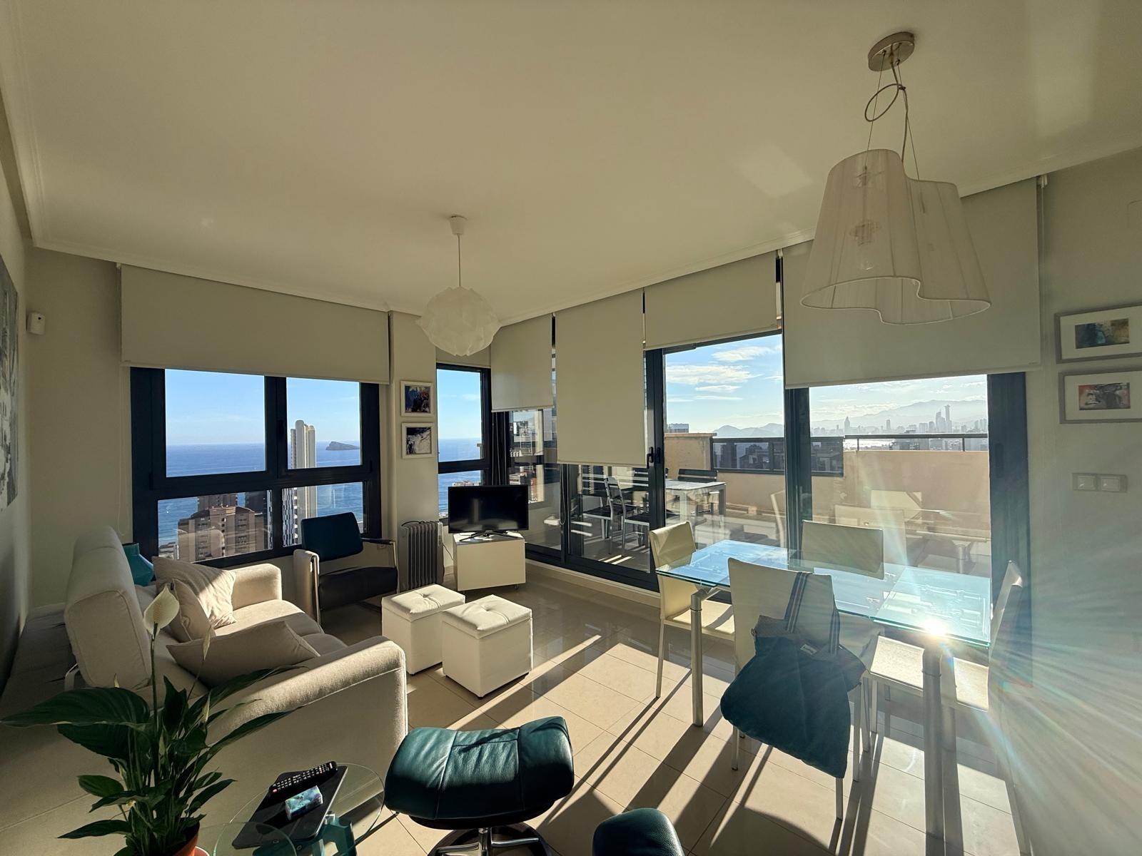 Inmobiliaria LES DUNES ofrece en exclusiva este maravilloso ático en la moderna urbanización Gemelos 26, en el Rincón LLano a unos 400 metros de la Playa de Levante.~El piso ofrece unas dimensiones superiores a las de el resto de las~viviendas. Tiene 2 dormitorios, uno de ellos con una terraza con vistas al mar y baño en suite, otro cuarto de baño adicional, amplio salón-comedor con acceso a una terraza de unos 30m2 que ofrece unas vistas espectaculares y panorámicas al mar, montaña y a la ciudad de Benidorm. En la terraza hay un pequeños trastero/despensa.~~La cocina es independiente y ofrece vistas panorámicas igualmente. ~~Además, incluida en el precio viene una plaza de garaje subterránea privada y cabinada, una característica muy~importante en una zona donde el aparcamiento es muy deseado.~La urbanización ultra moderna y completa cuenta con una piscina comunitaria en una zona ajardinada muy bien cuidada, una piscina climatizada interior para poder disfrutar todo el año, zonas de tenis, paddle e~infantiles.~Aproveche esta magnífica ocasión de ser propietario de este fantástico ático.~Venta 550,000.- €~