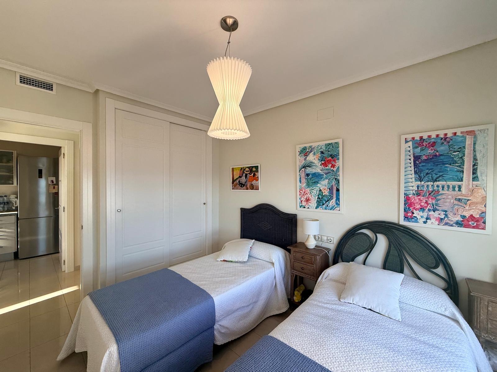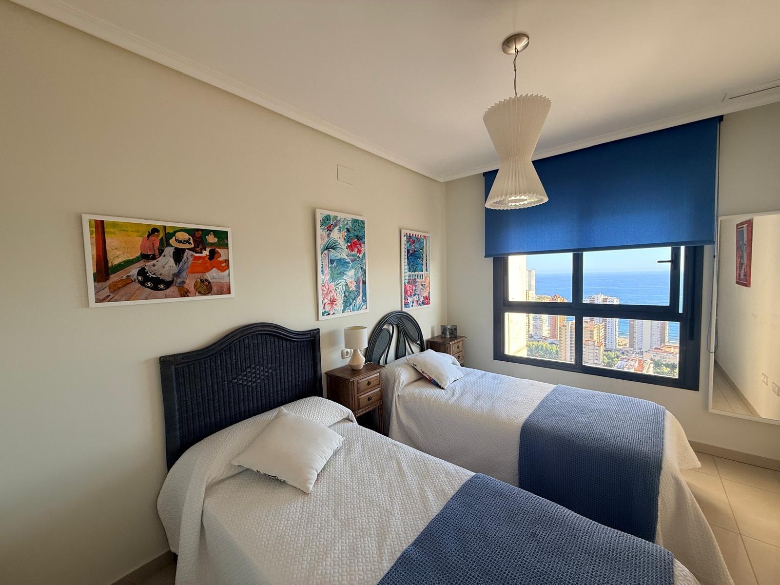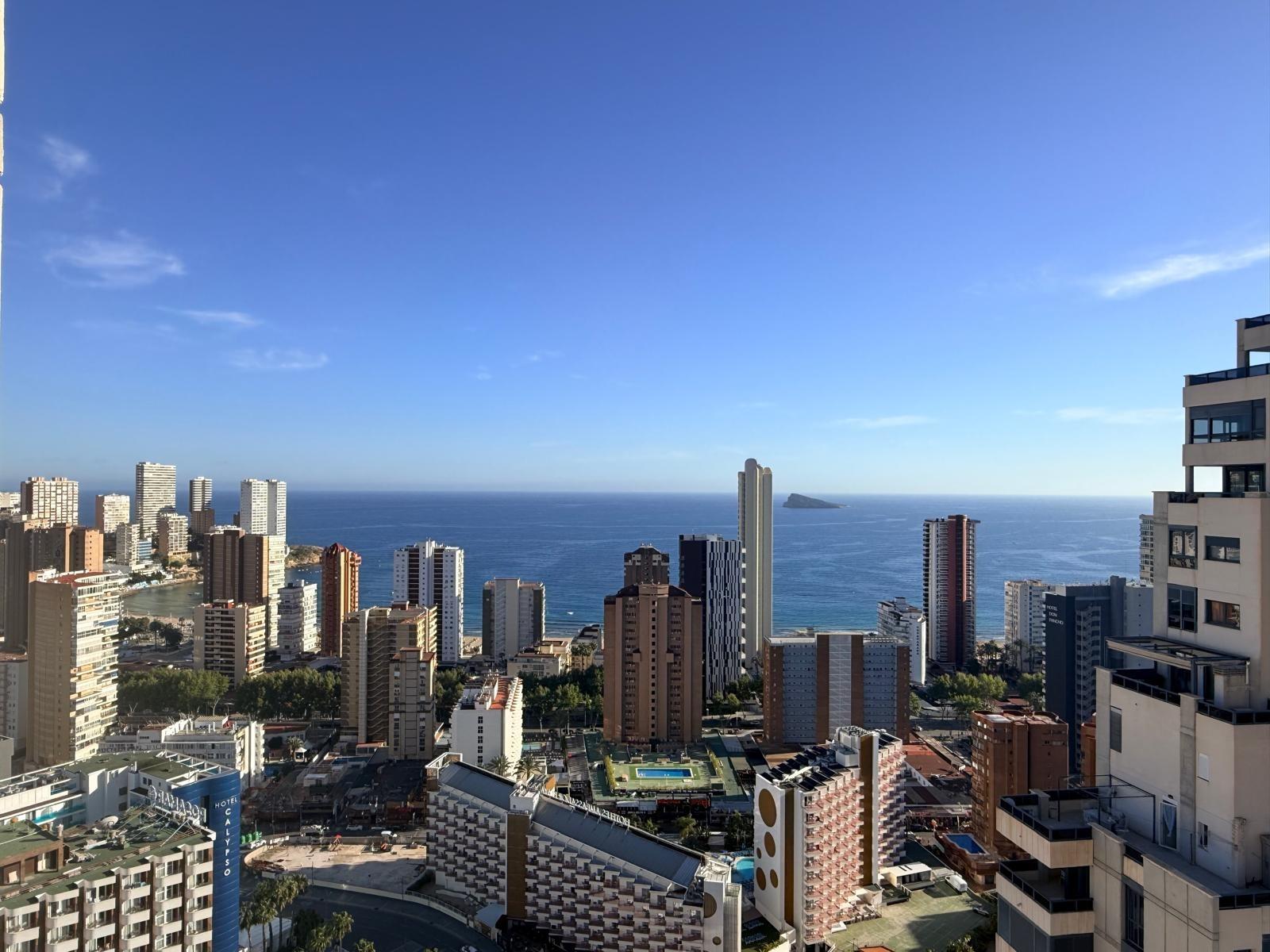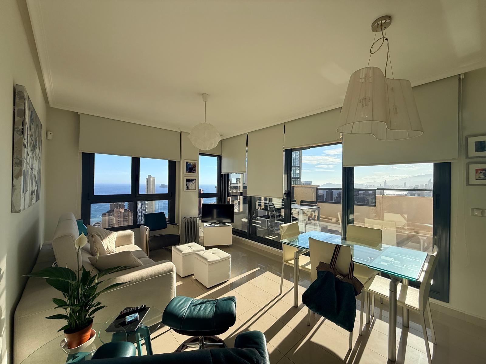 Inmobiliaria LES DUNES ofrece en exclusiva este maravilloso ático en la moderna urbanización Gemelos 26, en el Rincón LLano a unos 400 metros de la Playa de Levante.~El piso ofrece unas dimensiones superiores a las de el resto de las~viviendas. Tiene 2 dormitorios, uno de ellos con una terraza con vistas al mar y baño en suite, otro cuarto de baño adicional, amplio salón-comedor con acceso a una terraza de unos 30m2 que ofrece unas vistas espectaculares y panorámicas al mar, montaña y a la ciudad de Benidorm. En la terraza hay un pequeños trastero/despensa.~~La cocina es independiente y ofrece vistas panorámicas igualmente. ~~Además, incluida en el precio viene una plaza de garaje subterránea privada y cabinada, una característica muy~importante en una zona donde el aparcamiento es muy deseado.~La urbanización ultra moderna y completa cuenta con una piscina comunitaria en una zona ajardinada muy bien cuidada, una piscina climatizada interior para poder disfrutar todo el año, zonas de tenis, paddle e~infantiles.~Aproveche esta magnífica ocasión de ser propietario de este fantástico ático.~Venta 550,000.- €~